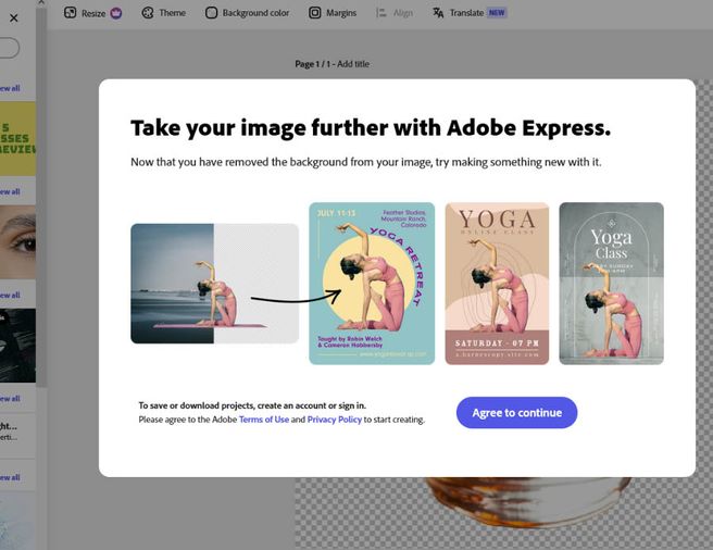 I used this free stand-alone feature to remove the background on three random photos from my computer. I was able to upload my image, remove background, and download result without having to sign-in to anything or create a new account. The downloaded results were the same size as the originals I uploaded and I was impressed with the job it did. If after clicking download, you stay on the page and wait (in my case anywhere from 5-30 seconds), the page refreshes and you now have your image, background removed, opened in the Adobe Express editor with this prompt over it.