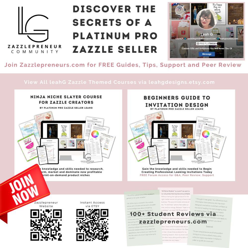 FREE Membership, additional content, guides and tools can be accessed ongoingly via the Zazzlepreneur website HERE. (not including the Zazzle Elevate Course Modules)