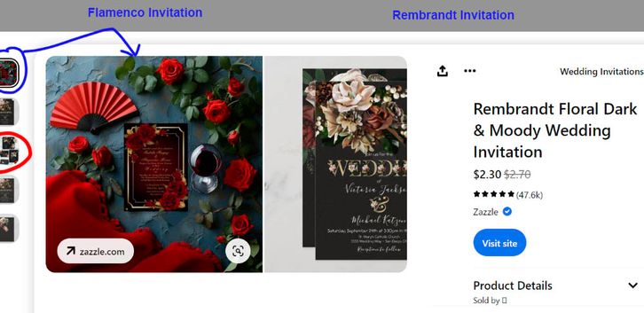 If you search up the Rembrandt invite on Zazzle, your Flamenco invite image is not there in the thumbs on the product page. It's possible it was there though as a glitch on Zazzle's end at whatever point in the time the pin was made. Who knows. It's a "rich" pin, pulling a price and product thumbs from Zazzle, so I am convinced this is was just a glitch that your image got in there, I don't think whoever made the pin intentionally used your unrelated image somehow, don't think it's even possible they could have made it appear in the pin this way even if they wanted to.